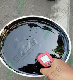 將立合劑桶蓋打開,置于液化氣灶上,點燃液化氣灶,用干凈的金屬棒將立合劑上下攪動(木棒上的木屑會進入材料內,會堵塞噴嘴)。用紅外線測溫槍測溫,夏季加熱溫度為120℃,冬季加熱溫度為150℃。